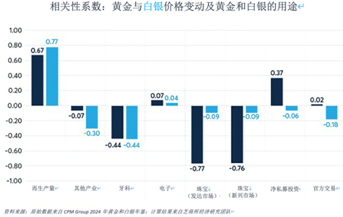 珠宝黄金与白银市场的连接点。因为黄金的价格是白银的70倍,当黄金价格上涨时,黄金珠宝需求就会下降;而白银珠宝需求相对不受价格影响,因为其成本远低于黄金。黄金与白银可以看作是一个双星体系,两颗星体围绕着一个共同的重心或质心运行。在这两者中,黄金的规模更为庞大、稳定性更高且影响力更为显著,但绝非不受白银牵引力的影响。