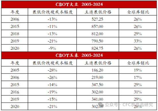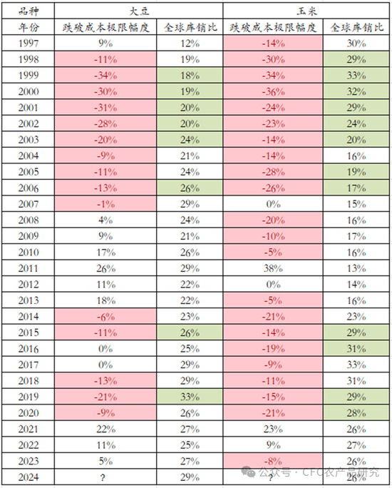 作物跌破成本的幅度或空头表达的强度大体上跟踪该全球库销比所处的位置,但即便是有了库销比作为标尺的参考,绝对的跌破程度在各个年份中方差极大,这种差异主要来自于商品联动特征。若完全以库销比一一对应,2024-25年度的全球大豆库销比压力堪比2019-20年度,以2024年1136美分每蒲直接推算(跌破幅度21%),则底部为897美分。以跌破成本的均值13%外推,则底部为987美分。
