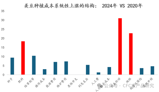 此外USDA数据显示未来一年的种植成本存在边际上调,暗示2020年以来的全球通胀已经形成了成本韧性,2024年每英亩种植成本较2020年提高近130美元每英亩(或+26%),从成本结构看,主要由肥料,设备折旧及地租分项贡献增量,这也暗示未来成本将趋势性上抬。