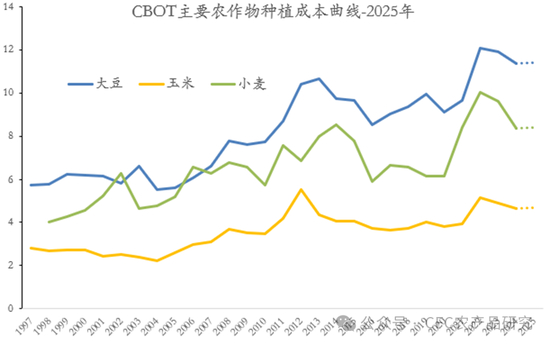上图显示,2025年的大豆,玉米,小麦在美国的种植成本仍旧预计迎来温和上涨,且本轮自2022年种植利润达峰后,种植成本受到价格下跌的负反馈过程基本结束。2024年美国大豆,玉米,小麦种植成本分别较2022年的变化为-6%,-10%,-17%。未来从估值的角度重新回到2015-2020年的低位区间的概率不大。