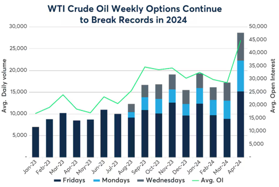 每周期权在第一季度的交易量继续创下新高,日均交易量达18,000份合约,较2023年同期增长10%。