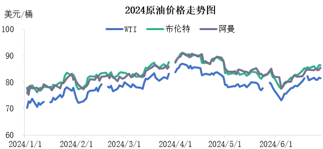 2024年,国际原油市场多空交织,油价整体呈现宽幅震荡走势。据金联创监测:截至2024年上半年,WTI年均价为78.81美元/桶,较2023年同比上涨4.04美元/桶,或5.40%;布伦特年均价为83.42美元/桶,较2023年同比上涨3.51美元/桶,或4.38%。
