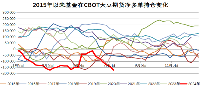 根据CFTC持仓报告,截至7月上旬,投机基金在CBOT大豆期货及期权市场的净空单达到17.26万手,这也是投机基金连续第六周增加对大豆的看空押注,累计净卖出15.84万手,成为历史上最强抛售力度之一。