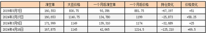 过去20年里,投机基金在大豆期市的净空单持仓共有四次超过16万手(连续超过16万手算作一次),其中三次出现在2024年。对这四次净空单超过16万手以后进行统计,发现一个月后基金均大幅减持了净空单,减持规模在2.5万~12.5万手不等,大豆期价也均出现了上涨,上涨幅度在25~70美分/蒲式耳不等。