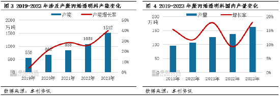 随着新产能进入的不断提速,国内透明料的产量亦呈现快速增长态势。卓创资讯数据显示,近五年当中,PP透明料产量平均增长率达到14.41%,高于PP产品9.09%平均增长率。其中2023年产量达到162.60万吨,同比增长17.96%,令国内透明料供应更加充裕。