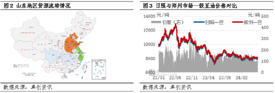 豆油市场贸易环节利润主要来自于区域间货物流转扣除运费所带来的价差收益,贸易环节利润的保证有利于提高豆油市场的流动性。近年来中国大豆压榨企业加大内地市场开拓,带动内地产能增长,内地豆油供应增加压缩了与港口市场的价差,导致贸易商收益受到挤压。从货源流转情况看,山东市场豆油货源主要流向华中、西北、苏北及华北南部,河南作为全国人口数量排名第三位的省份,对油脂需求较大。因港口产能大,豆油供应充足且价格偏低,内地原料运输成本高且产能有限但价格偏高,因此港口货源多流入内地市场消化。随着集团企业产能扩张,带动内地产能增长,河南市场2024年新增两条企业产线,豆油供应能力增加,对港口货源有一定冲击,进而缩小了港口与内地的价差。根据卓创资讯监测数据显示,2024年上半年一级豆油河南市场及日照市场平均价差139元/吨,较2023年同期收窄5元/吨,较2022年同期收窄280元/吨。此类现象普遍存在于各港口之间、港口至内地的货源流转上,区域价差的收窄令套利窗口缩小,贸易商利润遭受挤压的同时也影响了区域货源的流动性。