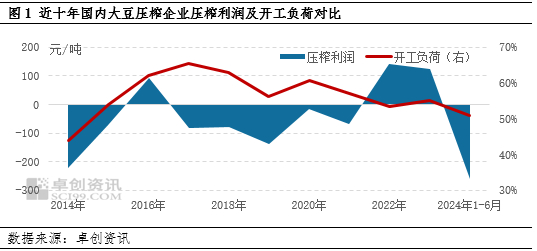 根据卓创资讯监测数据显示,2024年上半年企业压榨利润为-231元/吨,较2023年同期的-36元/吨亏损值扩大195元/吨,较2021年同期的18元/吨跌249元/吨;2024年上半年企业开工负荷率51%,较2023年同期持平,较2021年同期下滑2个百分点。近两年来,由于压榨利润持续亏损,大豆压榨企业开工意愿不高,整体维持在50%左右的偏低水平,导致豆油产出增量有限。(2022年多因素导致大豆到港成本及国内油粕现货价格出现极值,不作对比。)