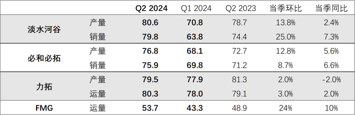 FMG 2024年二季度铁矿石的运量为5370万吨,同比增加10%,环比增加24%,矿石开采量为5900万吨,同比增加10%,环比增加27%。FMG二季度发运表现较好,在前期发运进度落后的情况下,最终仍然完成了24财年的年度发运目标,总发运量达1.92亿吨。FMG制定的25财年目标为1.9-2亿吨,整体相对谨慎。我们认为在二季度基数较高的情况下,FMG三季度发运或有一定环比下滑,但同比来看仍将保持增长。