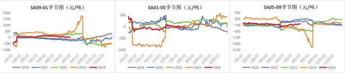 本周基差整体呈现走弱趋势。截至2024年8月2日,根据卓创资讯口径华北地区SA01基差81,较上周-95,跌幅53.98%,较去年同期-520,跌幅86.52%;SA09基差87,较上周-54,跌幅38.30%,较去年同期-48,跌幅35.56%。