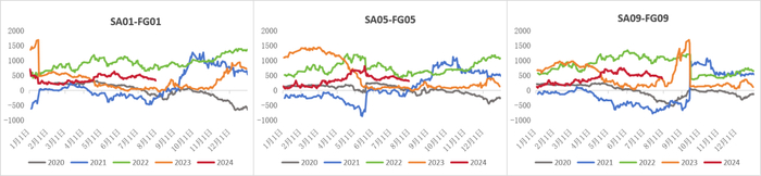 本周盘面价差增大。截至2024年8月2日,SA01-FG01为396,较上周上涨30,涨幅8.20%,较去年同期上涨381,涨幅2540.00%;SA05-FG05为360,较上周上涨30,涨幅9.09%,较去年同期上涨342,涨幅1900.00%;SA09-FG09为442,较上周下降2,跌幅0.45%,较去年同期上涨140,涨幅46.36%。