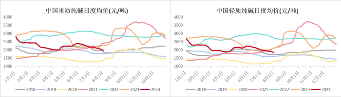 本周纯碱轻重碱现货价格小幅下跌,截至2024年8月2日,中国重碱均价1972元/吨,周变动-63.33(-3.11%),年变动-295(-13.01%);中国轻碱均价1821元/吨,周变动-73.34(-3.87%),年变动-296.67(-14.01%)