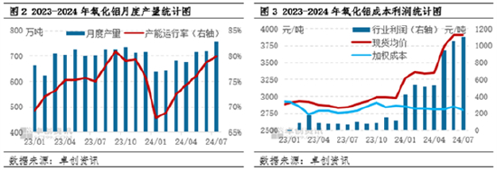卓创资讯监测数据显示,2024年7月国内氧化铝月度产量754.49万吨(31天计算),较6月增幅4.82%,同比增幅7.23%,考虑7月实际产出天数较6月多1天,约多产出24.34万吨,同比同天数增幅应为3.91%左右。2024年7月国内氧化铝月度产能运行率79.95%,较6月回升1.14个百分点,较去年同期回升4.99个百分点;2024年1-7月氧化铝企业产能运行率均值为74.04%,较2023年1-7月产能运行率73.68%,回升了0.36个百分点。氧化铝产出增多的关键在于今年企业利润空间的扩大,推升了生产企业的产出积极性,2024年7月氧化铝每吨利润均值在1104.06元/吨左右,较6月利润空间环比增幅5.16%,较去年同期增幅1527.69%,利润空间扩大明显。高利润提振氧化铝生产企业产能利用率回升,企业实际产出增加,相对应的市场货源应该充足,不过从目前现货市场反馈来看,现货市场可流通资源不多,部分企业长单交货量不足,甚至缩减了非冶金级方面的供应来保障电解铝方面的需求,现货供应表现偏紧,且三季度供应偏紧局面有望延续,将支撑氧化铝价格居于高位运行。