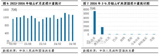 我国是铝产品的第一大生产国及消费国,铝土矿需求较大,5月以来,国内山西、河南地区铝土矿山虽有小规模复产,但实际产出量有限,加上铝土矿主要来源国几内亚正值雨季,进口铝土矿同样趋紧,矿产紧缺局面未缓和,国内多数氧化铝生产企业面临原料短缺的困境。从近两个月铝土矿进口数据来看,2024年6月来自几内亚进口铝土矿951万吨,环比增幅0.97%,来自澳大利亚进口量306万吨,环比降幅14.36%,两大主要铝土矿来源国6月总量1257万吨,而5月两大来源国总量1299万吨,减少了42万吨,基于后续几内亚雨季或延续至10月份,市场对于后市进口铝土矿紧缺预期不断升温,目前从部分氧化铝厂了解来看,铝土矿偏紧局面有所加重,7月铝土矿进口量料有减少,将制约氧化铝生产企业的运行产能,氧化铝偏紧局面短期难缓和。