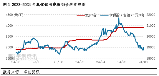 近期,电解铝价格下行至19000元/吨下方,呈现倒“V”行情,目前价格跌至2月下旬价格上涨之前的水平,截至2024年8月9日,电解铝价格自6月初下跌以来,已累计下跌了2070元/吨,跌幅9.82%。电解铝下游终端需求持续疲弱,社会库存累增压力加大,以及市场对于经济下行的担忧等因素导致电解铝价格下跌。不过,电解铝主要的生产原料氧化铝价格则持续居高运行,截至2024年8月9日,氧化铝市价3907.8元/吨,较6月初价格上涨2.8元/吨,涨幅0.07%。