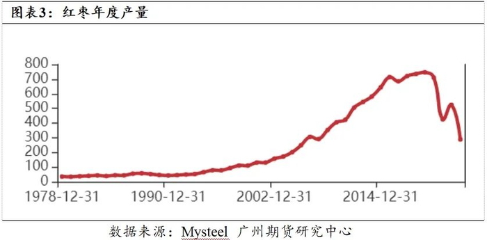 不过,尽管本年度红枣单产有望恢复常态,但最终产量是否大幅过剩仍有待商榷。2017-2020年是红枣产量高峰期,年均产量在700万吨之上,但随后由于价格持续性暴跌,枣农种植陷入亏损后出现了不少砍树现象。2021和2022年,红枣年产仅为426和524万吨,较此前数年显著减少。