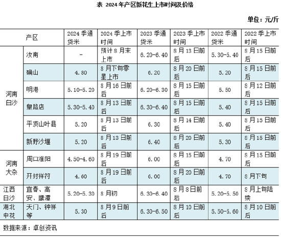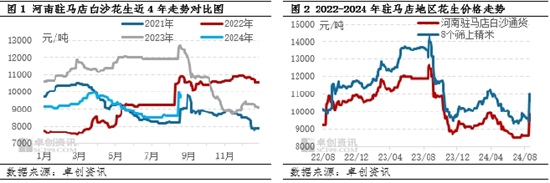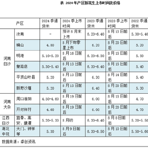 8月初开始江西产区新花生零星上市,因生长期雨季结束提前,整体单产不理想,且上市初期因天气原因刨出速度偏慢,白沙通货米开收价格5.20-5.30元/斤,8月23日下滑至4.80-5.00元/斤。湖北产区8月上旬中花五号少量上市,通货米开收价约5.30元/斤,8月下旬开始上量陆续增加,价格下滑至4.80-5.00元/斤。河南豫南地区白沙花生整体上市量不大,皇路店、新野、叶县等地8月中旬开始少量上市,开收价格5.20-5.40元/斤,至8月下旬上量普遍仍较少,且南阳地区因前旱后涝等天气因素影响下,新花生颗粒饱满度不及正常年份。驻马店及信阳等地春地膜花生播种面积不多,上市速度缓慢。截止到8月23日,白沙花生通货米收购价格下滑至4.70-4.85元/斤。周口、开封等大杂产区8月下旬有零星上市,较去年同期略有延后,且上市量仍低,开收价格4.50-4.60元/斤,因生长期多雨,周口局部新花生质量不理想,低洼地有死苗、泡水等现象影响质量。目前新季花生价格运行区间处于近四年的中间位置。