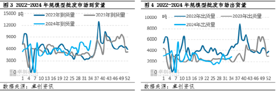批发市场方面,新花生上市后,一方面水份等质量方面有待继续好转,另一方面价格相对陈米缺乏性价比,因此整体采购积极性不高。目前陈米与新米价差约0.70元/斤,局部贸易商仍消耗陈花生。中秋之前部分食品厂如月饼等加工企业仍可适量消耗陈米,今年中秋节较往年提前2周左右,理论备货周期约在8月中旬前后,备货周期短的行业后续或仍有少量采购,但根据目前消费形势判断,或仍以随用随采为主。截止到8月22日,卓创资讯统计部分规模型批发市场花生到货量约2.7万吨,出货量约1.04万吨,同比去年虽有增加,但主因中秋时间较去年提前。从图3、图4可看出,对比2023年中秋前的备货周期,批发市场到货量变动不大,但出货量出现收缩。