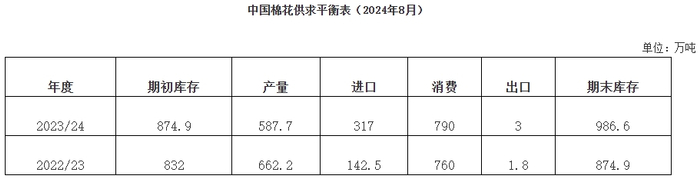 7月,国内市供应宽松,政策相对稳定,国家发放棉花进口滑准税配额数量20万吨,外棉进口大幅增量;纺织行业运行持续平淡,纯棉类产品销售迟缓,受棉价下跌影响,企业采购棉花持谨慎态度,现货成交偏弱。中国棉花协会预测:2023/24年度全国棉花产量587.7万吨,同比下降11.3%;进口量317万吨,同比增长1.2倍;消费量790万吨,同比增长4%;期末库存986.6万吨,同比增长12.8%。7月全国大部棉花处开花期,新疆局部地区进入裂铃吐絮期,气候条件总体适宜,单产有望再创新高,中国棉花协会预测:2024/25年度棉花总产量约605吨,同比增长3%。
