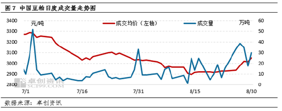 相比于供应端的预期,豆粕需求端的近期表现可以为市场提供更多的信心。卓创资讯数据显示,8月15日至30日,全国豆粕成交总量为247.78万吨,环比8月上旬增加137.11%,增量明显。从这一数据看,下游补充库存的动力较为充足,较前期悲观的需求预期有明显修复。
