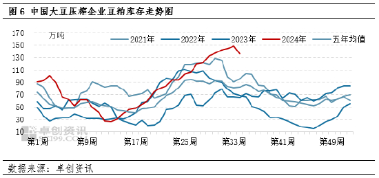 在上游库存持续增加、工厂持续催提、下游亏损加剧、市场心态悲观的背景下,豆粕现货价格自8月下旬起止跌反弹,在8月最后一个工作日,全国均价自8月6日以来再度站上3000元/吨。卓创资讯统计数据显示,9月全国大豆到港量为887.25万吨,低于市场预期。一方面7月后中国大豆到港量将进入季节性的减量,另一方面前期行业的亏损状态使得上游采购积极性较低。从上游的豆粕库存数据看,上周豆粕库存环比减少12.6万吨至135.7万吨,结束了连续21周的上涨势头。原料端的供应预期下降,对以供应主导的豆粕价格来说,是上涨的动力之一。