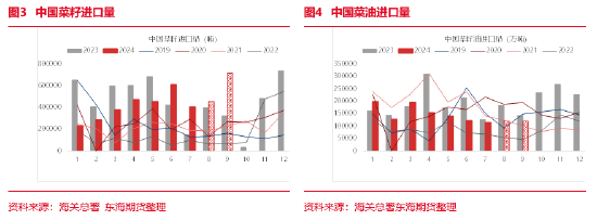 加拿大菜籽进口以大厂浸出法压榨为主,出油率一般在42%,出粕率为56%左右。俄罗斯进口非转菜籽以作坊式压榨法为主,产浓香菜油,参考国内非转菜籽出油率约36%。总体看,2023/24年度中国进口菜籽压榨将产出菜粕275万吨菜粕(不含菜籽饼),217万吨菜油。结合国内直接进口供应量,2023/24年度直接进口且含进口菜籽压榨生产的菜粕量为555万, 进口直接且含进口菜籽压榨生产的菜油417万。