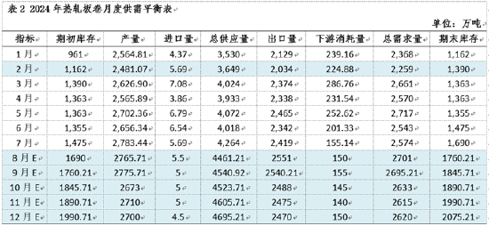 通过上表可以看出,2024年全年,热轧板卷基本处于供过于求格局之下,且供需指标——期末库存呈现逐步攀升局面,2024年1-8月热轧板卷价格重心持续下移,也成为供过于求带动价格下跌的验证,就9-12月来看,市场供需矛盾或继续升温,期末库存继续累积,在基本面运行背景下,预测热轧板卷9-12月价格重心或继续呈现逐步下移局面。