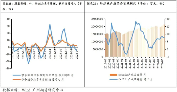 截至2024年8月底,中国大陆地区聚酯产能基数新增60万吨至8377万吨,新增产能主要以聚酯瓶片为主。其中涤纶长丝产能达4202万吨,聚酯瓶片产能基数达1943万吨,增加60万吨;直纺涤短产能达983万吨。内需方面,根据国家统计局统计,1-7月全国限上单位服装鞋帽、针、纺织品类商品零售类值为8033亿元,累计同比增长0.5%。据国家统计局数据,1-7月份,社会消费品零售总额273726亿元,同比增长3.5%,其中限额以上服装、鞋帽、针纺织品类零售额8033亿元,同比增长0.5%,增幅弱于社零,在实物商品网上零售额中,穿类商品增长6.3%。2024年7月份,全国居民消费价格同比上涨0.5%,其中服装价格同比上涨1.7%,环比下跌0.3%。服装价格当月涨幅明显强于CPI,衣着价格的坚挺形成支撑,但从社零增速来看,限额以上服装、鞋帽、针纺织品类零售额增幅连续2个月放缓,且显著弱于社零,终端纺织品服装内需仍不稳固,基础仍需加强。
