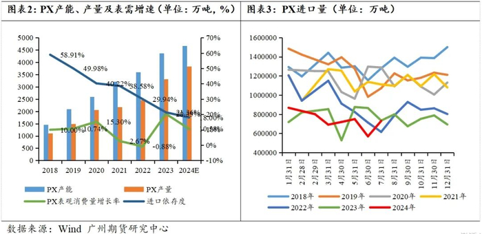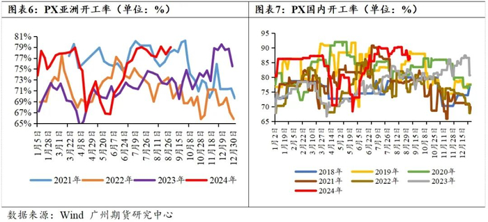 2023年,我国PX进口量为909.6万吨,进口依赖度约21.5%。从2019年开始国内大炼化PX产能开始投放,PX的进口增速出现负值,中国对PX的进口依赖大幅下降,从60%降至20%。细分来看,从去年四季度开始,亚洲PX开工一直高位,1-5月份进口同比+0.79%,进口量不降反增也许能解释一季度以来PX期价的弱势格局。二季度为亚洲PX装置检修集中检修季,叠加调油需求前置驱动亚洲出口美国的量增加,导致国内PX进口下降明显,因此6月进口量为56.91万吨,同比大幅下滑34%,综合来看6月去库18万吨。6月下半月以来国内及亚洲地区的多套PX装置检修工作结束并重新启动,开工负荷回升至高位,7月进口量随之回升为63.23万吨,环比+11%。进入三季度之后海内外检修装置重启,个别意外装置也部分恢复供应,PX供应较为宽裕进口量也稳步回升。2024年1-7月中国大陆进口PX总量502.8万吨,同比-6.86%。根据 CCF 统计,8月 PX 产量为 331万吨,环比小幅增加。综合来看,8月累库9万吨左右。截止9月6日,PX亚洲开工率为75.7%,环比-3.3%,国内开工率81.1%,环比-5.6%,开工降幅明显。主要原因是金陵石化60万吨PX装置月初降负至7成运行;盛虹石化400万吨PX装置下旬降负至9成运行;恒力石化520万吨PX装置下旬短暂降负一周时间至9成。四季度来看,国内外部分装置将进行检修,预期供应压力也将有所缓解。在 PXN大幅压缩后,亚洲PX进口量或有所有下滑。而 PTA 检修在推迟至四季度后期后,需求端对 PX 的支撑目前看仍尚可。但四季度PX面临年度长约签订,PTA工厂打压PX现货,后续不太乐观。