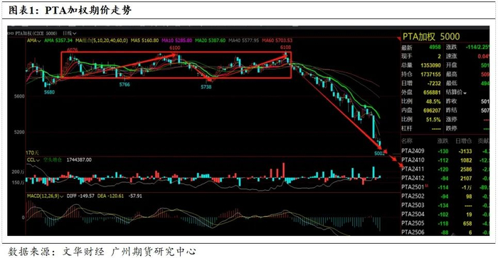 2024年上半年,受市场需求疲软及行业利润不佳聚酯产业链价格整体呈现窄幅波动态势,PTA和PX作为聚酯产业链的关键原料,其价格波动幅度相对较小。进入三季度,8月份宏观外围波动加大,美国经济数据走弱,降息预期强化,股市、商品、汇市均剧烈动荡,市场心态受到明显冲击。成本大跌拖累市场心态,流动性充裕背景下 PX 同样偏弱,价格均创下年内新低。随着原油价格暴跌及聚酯下游5月以来的减产挺价负反馈至原料端,PX-PTA期价跌破上半年的震荡区间下沿,开启暴跌模式弱势探底。截止9月6日PTA2501合约已经跌破5000元/吨,创下2023年以来新低。