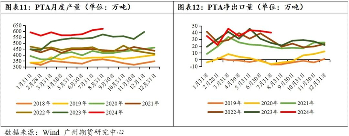 展望四季度,三房巷3#200万吨、远东仪化320万吨PTA装置计划投产,下半年PTA供应压力仍较大。出口情况来看,2024年1-7月累计出口量263.48万吨,同比增18.46%。7月净出口39.89万吨远低于市场预估的50万吨加剧PTA累库,8月出口量预估40万吨左右,预估2024年四季度出口量仍维持月均40万吨左右,宏观形势上来看近期贸易战加剧打击有出口需求的品种,PTA出口方面提振有限。