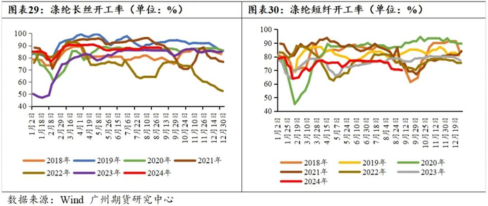 2024年上半年,聚酯产业链聚酯端产成品库存高位库存压力较大,聚酯平均利润一直处于亏损状态。5月之前聚酯的整体开工主要是长丝以量换价情况尚可,但进入5月份后,受持续亏损和高库存的影响,5月23日长丝龙头企业围绕加工费大幅提价来限产保价,即采取“聚合成本(PTA+MEG)+加工费”限定价格并适时调整开工情况,实行1个月后长丝效益得到明显改善。截止9.6中国PTA库存天数4.61(+0.24);江浙涤丝工厂POY、FDY、DTY权益库存分别在22.1(+3.9)、19.8(+2.7)、30.6天(+1.7),虽然市场进入9月,但成本持续下跌的现实和持续偏弱的成本预期压制下游的订单释放,织造厂销售偏弱的现实下,加弹和织造多以消化前期原料备货为主,涤丝工厂销售偏弱,涤丝工厂权益库存继续上升。本周纺纱用直纺涤短开机率在83.2%(+2.7%),1.4D权益库存在16.1天,实物库存25天,聚酯工厂产成品库存压力较大。阶段性下游订单不足,涤丝工厂的在库压力缓解比较困难。