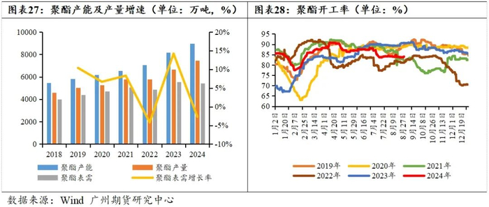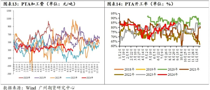 截至2024年8月底,国内PTA产能达到8512万吨。至2024年底,PTA产能总量将达到9032万吨左右,产能表需增速约5.35%。下半年来看,还有520万吨的新增产能存在释放的预期,但产能投放预期可能会推迟年底。由于新产能在原料单耗、产出比以及能耗控制上面表现优异,部分落后产能或中小型PTA产能加速淘汰,预估淘汰长停的落后产能232.5万吨。装置加工费方面,产业链利润集中在原料PX端,今年PTA大厂控开工率情况较往年强势,上半年PTA盘面平均加工费在370元/吨中位偏低水平波动,整体相对平稳。但进入三季度尤其是8月中旬,随着原油的大跌带动聚酯原料价格重心大幅下挫,PTA加工费由7月底的431.36元/吨大幅压缩至256元/吨,环比大幅缩减68.36%!后期来看部分PTA企业或会开启计划外装置检修。
