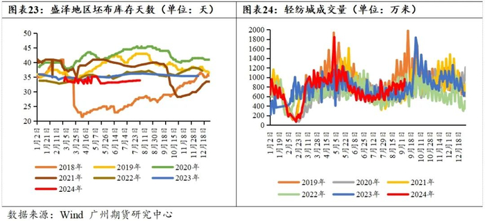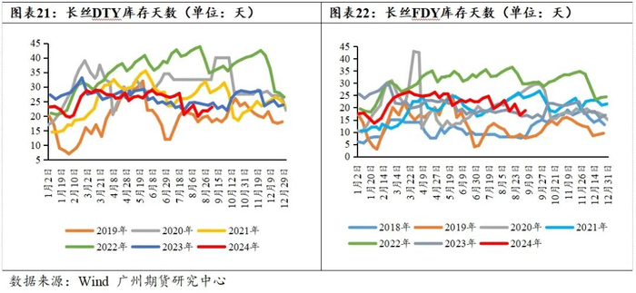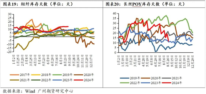 展望四季度,根据下游原料备货及坯布库存综合数据来看,目前盛泽地区坯布库存天数34.2天,织造端坯布依旧处于淡季,内外销、服装和家纺都未有动静,整体坯布库上升,关注后期终端需求的改善力度情况。据CCF本周调研的情况来看,由于生意改善力度还是很弱,坯布库存本周继续小幅积累,尚未出拐点,仍需要继续等待。目前聚酯长丝工从目前的内外环境以及6-7月份公布的内销和外贸数据看,市场对旺季偏悲观。9月底10月上旬时候聚酯需求或有改善,11月份要看双十一补单情况, 12月到1月是明年外贸订单和明年春季订单下单的时期,外贸订单得看11月美国大选落定之后才会有定数。但今年的春装滞销,叠加大家都国内消费形势也不太看好,年前春季订单下单量估计也有限。厂和下游织造企业库存相对偏高,纤维端库存贬值压力较大。