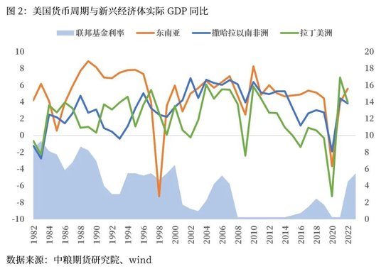 那么这些国家和经济体,除了自身独有的政治环境外,历史经验显示大部分新兴市场的经济周期,与美联储的货币周期高度一致。如果复盘美联储货币周期与中国打开市场的重点新兴经济体表现,可以发现美国货币周期,与东南亚呈现极高度的捆绑。2000年以后与非洲与拉美也呈现较高相关。2000年之前,非洲受制于更频繁的内战,拉美受困于债务陷阱,表现出不匹配发展中国家的低增速水平,也不太参与到全球一体化的进程中。