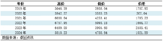 表1 2019-2024年1-9月进口阔叶浆高低价差表