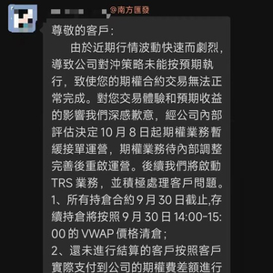 投资者周先生(化名)透露,他在9月30日前下的多单被欧普国际、南方汇发等多个券商陆续在当天下午通知全部清仓,按照收盘价进行清算。然而,他和其他投资者至今未收到应退的期权费,他所损失的期权费近300万元。目前,涉及的投资者已成立了数个维权群。
