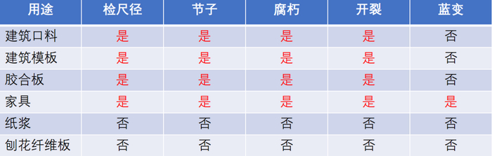不同用途对原木的质量要求不同(强度、稳定性、美观性、耐久性等)。国内原木主要定价标准核心指标为检尺径,其次看节子、开裂、腐朽、蓝变等。