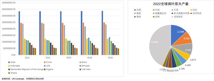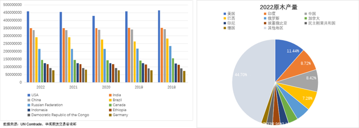 根据UNCOMTRADE数据显示,2018-2022年,全球原木产量维持在40亿立方米左右。022年产量前10的国家占总产量的55.30%。其中,分国家来看,美国是全球原木产量第一的国家,产量4.59亿立方米(11.44%),印度3.5亿立方米(8.72%),中国3.38亿立方米(8.42%),巴西2.92亿立方米(7.28%),俄罗斯约2.2亿立方米(5.41%)。