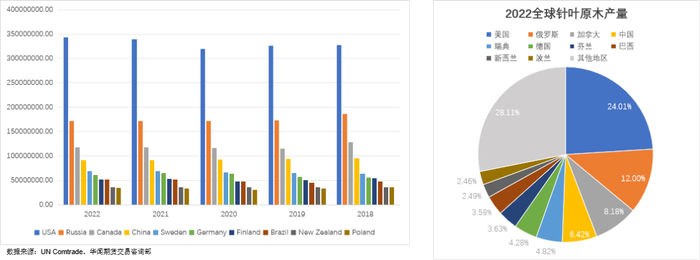 2018-2022年全球针叶原木产量在14亿立方米左右,针叶原木产量前十的国家占全球总产量的约72%。2022年,针叶原木产量前十的国家分别是(按产量由大到小):美国3.44亿立方米(24.01%)、俄罗斯1.72亿立方米(12%)、加拿大1.17亿(8.18%)、中国0.92亿(6.42%)、瑞典0.69亿(4.82%)、德国0.61亿(4.28%)、芬兰0.52(3.63%)、巴西0.51亿(3.59%)、新西兰0.36亿(2.49%)和波兰0.35亿(2.46%)