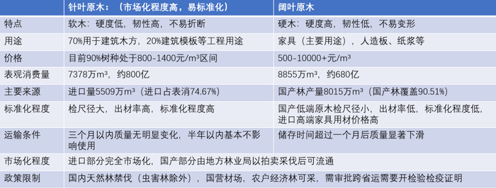 按材质:原木可分为针叶树和阔叶树两种,每种木材都有其独特的特性和应用领域。