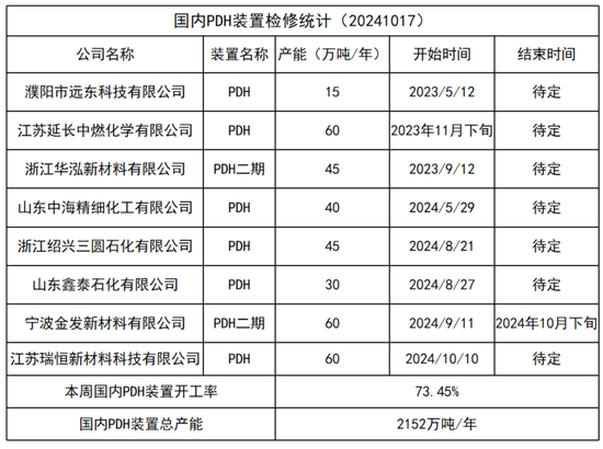 全国目前共37套PDH装置,截至10月17日,PDH装置开工率为73.45%,较前一周回落1.11个百分点。