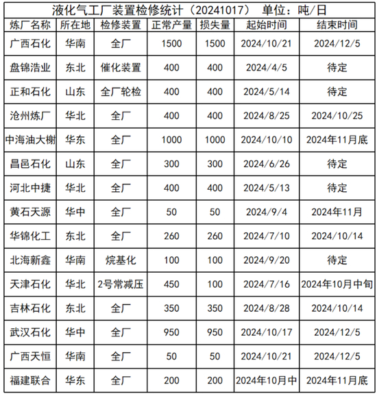 国内液化气装置检修情况