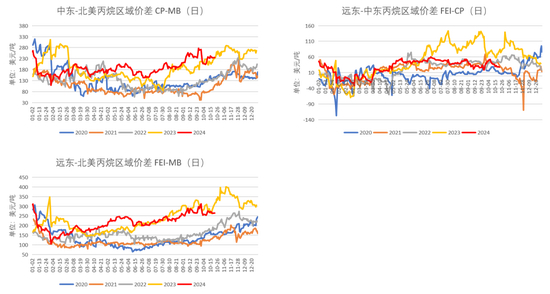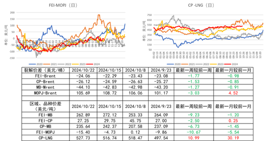 截至10月22日,中东-北美丙烷区域价差为235.64美元/吨,较前一周-6.73美元/吨;远东-中东丙烷区域价差为27.25美元/吨,较前一周-2.5美元/吨;远东-北美丙烷区域价差为235.63美元/吨,较前一周-6.73美元/吨。