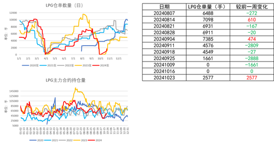 截至10月23日,LPG本周新增仓单2577手;主力合约持仓量周内回升明显,但仍处于往年同期中性略低位置。