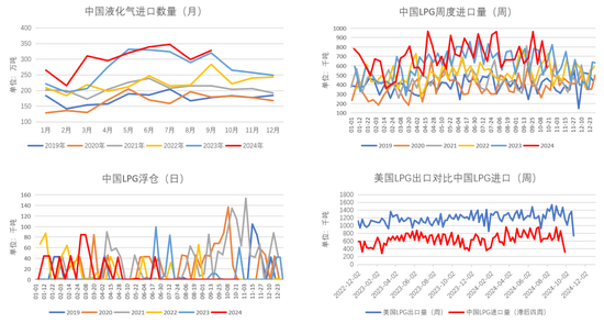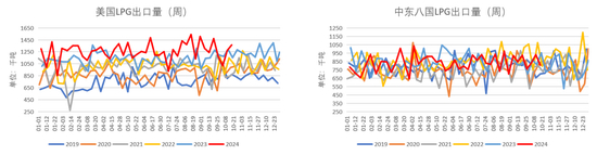 上周美国LPG出口量有小幅增量,高于往年同期;中东八国LPG出口量较前一周有小幅减量。