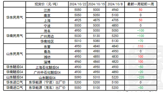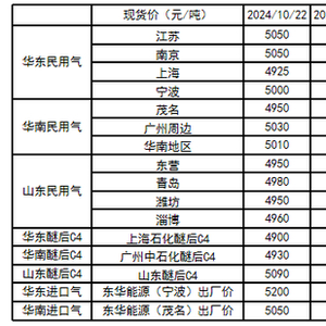 截至10月22日,华东-华南民用气现货区域价差为-30元/吨,较前一周+100元/吨;华南-山东民用气现货区域价差为70元/吨,较前一周-200元/吨;华东-山东民用气现货区域价差为40元/吨,较前一周-100元/吨。