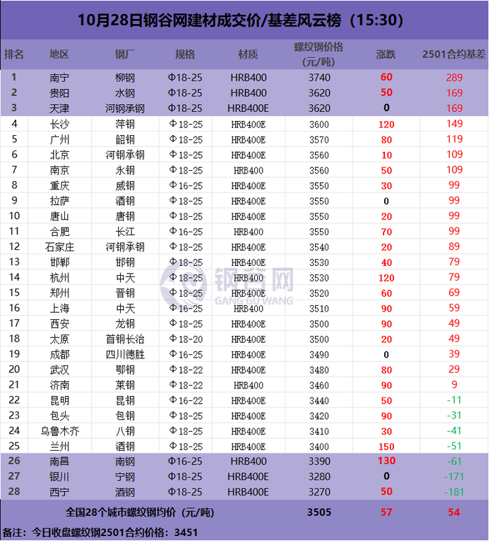 今日国内建筑钢材价格大幅上涨,其中南宁螺纹钢价格3740元/吨,位居今日全国建材成交价榜首;其次贵阳螺纹钢价格3620元/吨,天津螺纹钢价格3620元/吨。全国28个城市螺纹钢均3505元/吨,较上一交易日价格跌57元/吨。