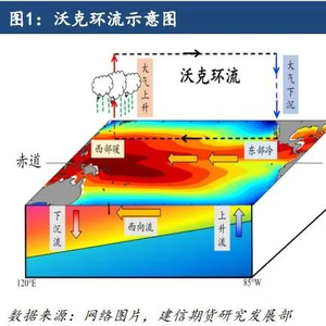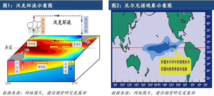 1924年英国气象学家沃克发现印度洋和太平洋的海平面气压空间分布呈现出一种“跷跷板”的关系。当太平洋上气压变高时,印度洋上从非洲到澳大利亚的气压则会变低。他将这种气压变化形式命名为“南方涛动”。此外,在东南信风的作用下,温暖的赤道表层海水会从东太平洋流向西太平洋,使太平洋水温呈现出西高东低的状态。海水的温差又影响了空气,西太平洋因海温高气压低形成了上升气流,而东太平洋因海温低气压高形成了下沉气流,在海洋与大气相互作用下形成了一个封闭的环流,被命名为“沃克环流”。当东南信风更加强烈的年份,更多的暖水被送至西太平洋,沃克环流进一步被加强,东太平洋海水表面温度出现异常下降,这种现象则被称为“拉尼娜”,当这一现象持续5个月以上时则被认定为发生了拉尼娜事件。反之,当东南信风走弱的年份,大量暖水不能达到西太平洋甚至回流,沃克环流被削弱,东太平洋海水表面出现异常升温,这种现象则被称为“厄尔尼诺”现象或事件。