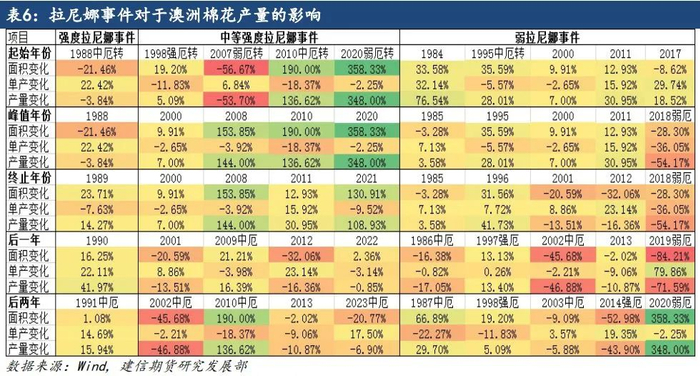 澳大利亚方面,拉尼娜事件较大概率引发棉花产量的提升,在拉尼娜事件起始到终止的所有阶段增产可能性都较高。而在厄尔尼诺年份棉花产量下降的概率则会提升。