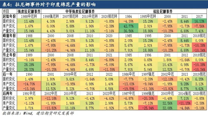 拉尼娜对于印度棉花产量的影响以提升为主,且在起始年份的正向效果最为明显。在中等强度拉尼娜事件下,峰值年份和终止年份产量趋向下降;而在弱拉尼娜事件下,峰值年份和终止年份产量仍多数提升但幅度会有所削弱。随后在拉尼娜转向厄尔尼诺的年份,印度棉花产量则多表现为下滑。